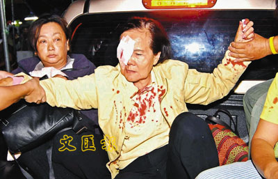 被炸傷的一名黃衣示威者眼部血流不止,在其它人協(xié)助下撤離現(xiàn)場