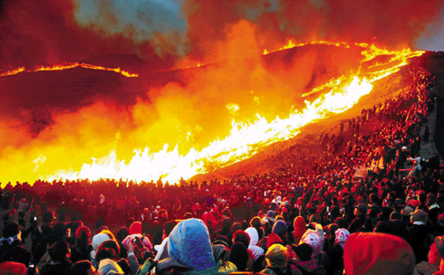 當(dāng)?shù)貢r間,9日晚6時15分許,慶尚南道昌寧郡昌寧邑火旺山(海拔757米)山頂附近舉行“火燒紫芒活動”時,在海拔742米的“舟巖”附近大風(fēng)突然改變方向,導(dǎo)致火苗越過防火線向游客方向蔓延過來。來不及躲閃的4名游客被火燒死,52人掉下懸崖受傷或被火燒傷。據(jù)了解,死者包括三名女性和一名男性。警方出動180人搜尋死傷者,但由于夜已深,于晚11時左右撤離。警方將于10日上午出動400多人再次展開搜救工作。