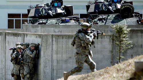 中新網(wǎng)3月11日電 據(jù)韓國《中央日報(bào)》報(bào)道,10日是韓美“關(guān)鍵決斷(key resolve)”聯(lián)合軍事演習(xí)的第二天,京畿道抱川駐韓美軍羅德里格斯(Rodriguez)射擊場上,韓美海軍展開巷戰(zhàn)訓(xùn)練。美軍士兵正朝著假想敵軍占領(lǐng)的建筑物前進(jìn)。