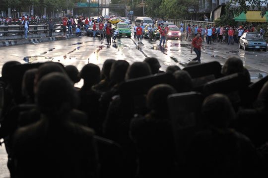 軍方凌晨開始對占據(jù)曼谷勝利紀念碑主要路口的示威者采取驅(qū)散行動,引發(fā)激烈沖突。沖突點距離“紅衫軍”抗議主場——曼谷總理府——只有數(shù)公里。軍方和示威者以催淚瓦斯、實彈和汽油彈互相攻擊。至中午時分,軍方向市中心的示威者開槍并發(fā)射高壓水炮。