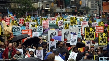 紐約的示威者進行了2分鐘默禱,紀念2003年伊拉克戰爭的亡魂。約各有上萬人參加了在芝加哥和舊金山的反戰示威。