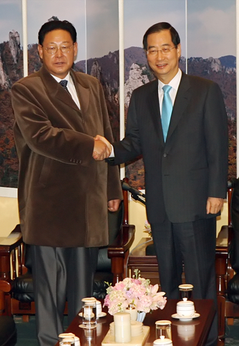 中新網(wǎng)11月14日電 韓國(guó)總理韓德洙今天上午在首爾華克山莊接待室里同朝鮮總理金英日親切握手,第一次朝韓總理會(huì)談?wù)归_(kāi)。