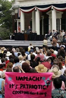 據香港《文匯報》等媒體報道,布什在第3任總統兼《獨立宣言》起草人杰斐遜在弗州夏洛茨維爾的故居發表為時僅有10分鐘的演說,期間至少9名示威者被押送離開。有示威者呼喊“彈劾布什!”又有示威者罵他“戰犯”。