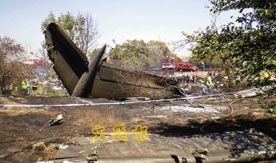 發生空難的地面一片焦黑,可見斷開的機尾。