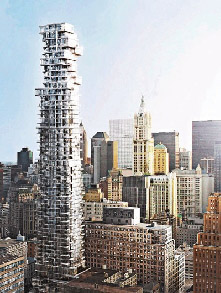 中新網(wǎng)9月15日電 為北京奧運(yùn)會(huì)“鳥巢”體育館進(jìn)行設(shè)計(jì)工作、受到各方贊嘆的兩位瑞士建筑設(shè)計(jì)師赫爾佐格(Jacques Herzog)和德默隆(Pierre de Meuron),將會(huì)把他們的創(chuàng)意帶到紐約。他們參與在紐約市內(nèi)興建一座透明玻璃摩天大樓。當(dāng)這座建筑物在后年建成后,驟眼看好像一層層單位半浮懸在空中,令人類幻想中的“空中樓閣”活現(xiàn)眼前。