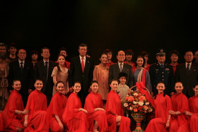 演出開始前,金永南委員長等朝鮮領導人會見了藝術團主要成員及舞劇主要演員。