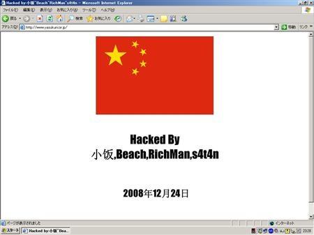 12月24日,靖國神社官方網(wǎng)站的主頁被抹去,并寫上英語“網(wǎng)頁被小飯、海灘、里奇曼、s4t4n攻擊”( Hacked By 小飯,Beach,RichMan,s4t4n),最后落款日期“2008年12月24日”。報(bào)道稱,網(wǎng)頁上還畫有中國國旗,因此可能是國外黑客的“不法襲擊”。