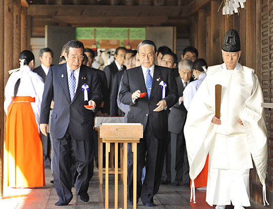 日本政府方面除財務副大臣竹下亙、文部科學省副大臣山內俊夫、經濟產業(yè)省副大臣高市早苗外,內閣府的宇野治、法務省的早川忠孝、厚生勞動省的戶井田徹、農林水產省的江藤拓及野村哲郎、國土交通省的西銘恒三、防衛(wèi)省的岸信夫等7名政務官也前往參拜。