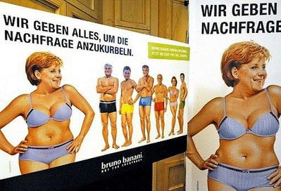 據法新社報道,德國一家內衣公司5月1日在柏林著名商業街庫達姆街推出了一個1000平方英尺的巨幅電子廣告牌,廣告牌上是德國政治家著內衣的形象,其中包括德國總理默克爾,她身穿一套紫色胸罩和運動短褲。廣告牌上的文字寫著:“我們盡全力增加需求!