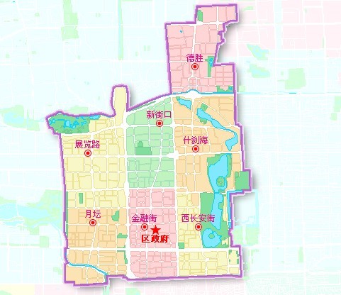 中華人民共和國成立后,1950年4月18日,中央人民政府政務院批準將北京市調整合并為16個區,今區境內為第2區和第4區全部、第5區之西半部及第13、第14區的一部。1952年9月,市政府再次調整區劃,今區境內為西單區和西四區及海淀區、前門區的一部分,第2區更名為西單區,第4區更名為西四區。1958年5月經國務院批準,西單、西四二區合并為西城區至今。1987年9月北京市將朝陽區馬甸0.6平方公里劃給西城。至此,西城區面積31.66平方公里,F在轄區有西長安街、展覽路、新街口、金融街、月壇、德勝、什剎海七個街道辦事處。