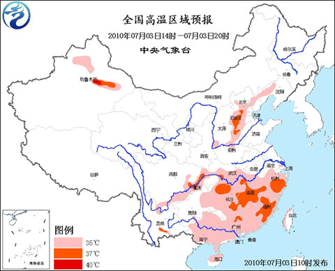 中新網7月3日電 中央氣象臺3日10時發布高溫黃色預警:預計,今日下午,江淮西南部、江漢南部、江南大部、華南大部、貴州東部、重慶大部、四川東部和南部、云南東北部等地有35~37℃、局地38~40℃的高溫天氣。另外,遼寧西部、北京中南部、河北大部、山西西南部、河南北部等地的部分地區也將有35~37℃、局地38~39℃的高溫天氣。