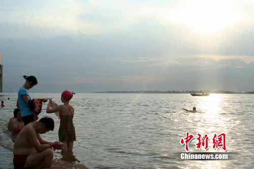 當天,九江天氣最高溫度達到37度,記者在潯陽江廣場旁看到不少當?shù)厥忻裨跐£柦?長江九江段)邊上游泳解暑,其中還有不少小孩和老人。