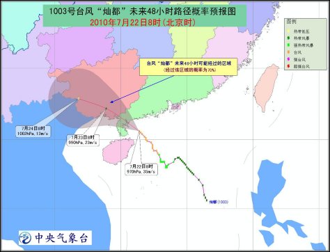 預計,“燦都”將以每小時15公里左右的速度向西北方向移動,即將于22日下午在廣東湛江到吳川一帶沿海登陸。