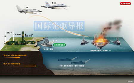 外界估計中國的“東海-10”巡航導彈可打擊1800公里,“蘇-30”、“飛豹”等擁有對海攻擊力的戰機作戰半徑都在1000公里以上,“東風-15”射程600公里,“東風-11”戰術導彈射程300公里,這些部署在中國各地、在有效射程內的打擊武器與海軍岸防部隊、水面水下部隊一起形成立體打擊體系。這些守方近岸的非對稱作戰優勢是美海軍遠來所不具備的。