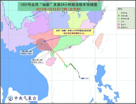 預計,“燦都”將以每小時15公里左右的速度向西偏北方向移動,將于22日晚上進入廣西境內,強度逐漸減弱。