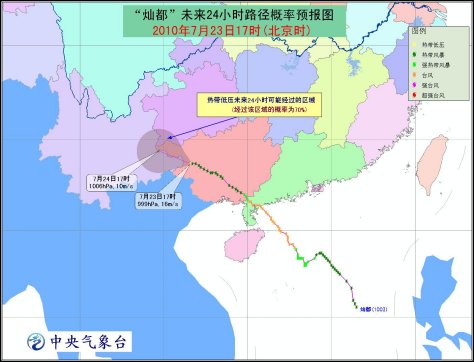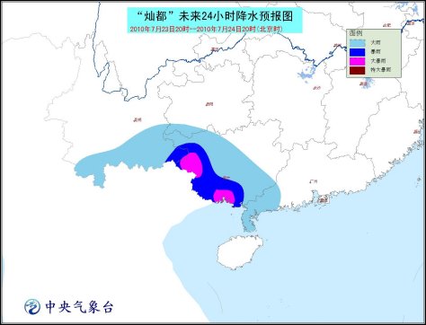 受“燦都”減弱后的低壓和西南季風的共同影響,23日晚上到24日白天,北部灣、廣西沿海仍將有6-7級大風,陣風可達8-9級;廣東西南部、廣西中南部和西部、云南南部和西部、貴州西南部等地有大雨或暴雨,其中,廣西西南部和南部的部分地區有大暴雨,局地有特大暴雨。