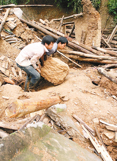 15歲的邵玉乾能撿回一條命完全得益于他的貪玩。24日上午,盡管雨大,他還是帶著小外甥到房子后面的山坡上玩,不巧,小外甥陷到泥里,全身濕透,他跑回去給拿了件衣服。剛到半山腰,突然,腳下好像地動(dòng)山搖,緊接著“卡啦卡啦”巨大的聲響,像爆炸一樣,山上的泥石流瞬間沖向?qū)γ娴纳狡,又折回頭沖向他這邊。他前面不遠(yuǎn)處的一排房子全倒了。他趕緊跑過去看,奶奶被泥石淤在腰部,大聲喊著救命。這時(shí),旁邊有人趕來(lái),幾人用手刨了2個(gè)多小時(shí),奶奶終于被救出。但是,邵玉乾的姐姐邵玉娟、妹妹邵玉苗,卻被埋在泥石之下。