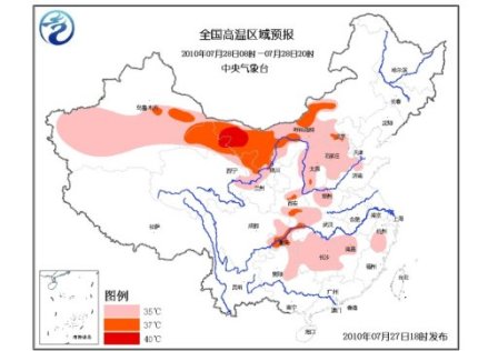 預計,明天白天,北京大部、天津西部、河北中西部和南部、山西大部、陜西東部及關(guān)中大部、寧夏西部、河南中西部、山東北部、湖北西部、四川盆地東北部、重慶大部、貴州東部、湖南大部、江西西部、浙江西南部等地有35℃以上的高溫天氣,局地最高氣溫可達37~38℃;內(nèi)蒙古中西部、甘肅中西部、新疆吐魯番盆地及南疆盆地大部等地將有35~37℃的高溫天氣,局部地區(qū)最高氣溫可達40℃以上。