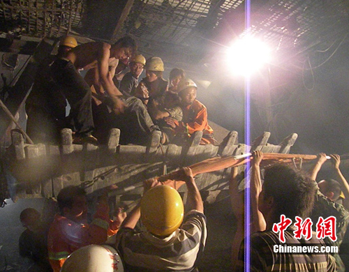 中新網汶川8月11日電(劉忠俊 李濤)11日凌晨4時32分,四川汶川縣草坡鄉草坡2號橋旁一在建隧道發生垮塌,一工人被巨石壓于其下,經過消防官兵2個多小時的緊張救援被壓工人成功獲救。