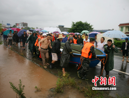消防、群眾正在緊急搬運沖鋒舟。劉忠俊 攝