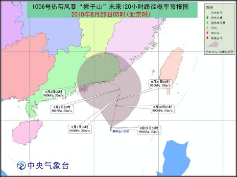 中新網8月29日電 據中央氣象臺網站消息,中央氣象臺于8月29日10時繼續發布臺風藍色預警,2010年第6號熱帶風暴“獅子山”的中心將以每小時5至10公里的速度向偏北方向移動,強度逐漸加強,并向廣東東部到福建南部沿海靠近。29日中午到30日中午,南海北部、廣東東部沿海、福建南部沿海將有6至7級大風。