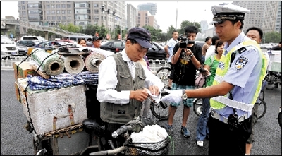 昨天上午9點(diǎn),記者在東單路口看到,8名民警“把守”在路口4個(gè)方向,由于正值上班高峰,路口騎車(chē)人較多,大部分人能等待紅燈,幾名想“闖關(guān)”的騎車(chē)人被民警和協(xié)管員攔住。市民小陳騎電動(dòng)自行車(chē)載人,被執(zhí)勤民警攔下并處以罰款20元。記者注意到,民警處理的多是自己加裝動(dòng)力裝置的三輪車(chē)。“自行加裝動(dòng)力裝置很危險(xiǎn)!泵窬f(shuō),行人、非機(jī)動(dòng)車(chē)的違法行為主要有騎車(chē)帶人、逆行、闖紅燈等。昨天上午兩個(gè)小時(shí)內(nèi),僅東單路口一處,民警就處罰了20多起行人、非機(jī)動(dòng)車(chē)的違法行為。