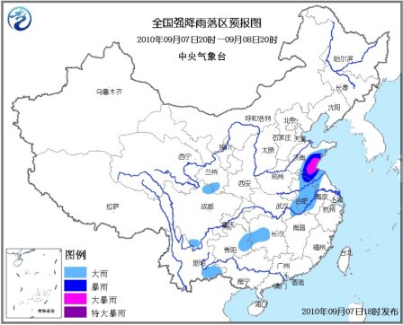 中新網9月7日電 據中央氣象臺網站消息,中央氣象臺9月7日18時繼續發布暴雨藍色預警:9月7日20時到8日20時,山東中南部、安徽大部、江蘇北部和西部、湖北東部、湖南中部偏西地區、貴州東部、甘肅東南部、川西高原北部、云南東南部等地有大雨或暴雨,其中,山東東南部和江蘇北部的局部地區有大暴雨;上述部分地區并伴有短時雷雨大風等強對流天氣。
