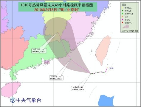 預計,風暴中心將以每小時10-15公里的速度向偏西方向移動,以后逐漸轉向西北方向移動,并向廣東東部到福建南部一帶沿海靠近,強度逐漸加強,將于9日夜間到10日上午在這一帶沿海登陸。