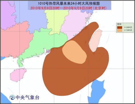 受熱帶風暴和西南季風共同影響,9月8日晚上到9日白天,巴士海峽、巴林塘海峽、臺灣海峽、南海北部和中部的偏東海面、臺灣東南部海面以及臺灣南部沿海、福建中南部沿海、廣東中東部沿海將有7-9級大風,風暴中心經過的附近海面或地區的風力有9-10級,陣風可達11-12級;福建中南部沿海、廣東中東部沿海、臺灣中南部以及海南南部、廣西南部沿海將有大雨或暴雨。