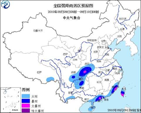 中央氣象臺2010年9月9日06時繼續發布暴雨藍色預警: