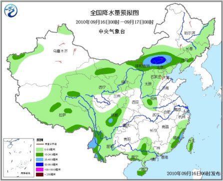 中新網(wǎng)9月16日電 據(jù)中央氣象臺預(yù)報(bào),未來三天,新疆西部、青海、西藏中東部和南部、西北地區(qū)中東部、內(nèi)蒙古大部、東北大部、華北、云南、四川等地有小到中雨或陣雨天氣,其中,內(nèi)蒙古中部偏南地區(qū)、華北中北部、云南西部、遼寧及臺灣東部等地的部分地區(qū)有大雨,局地有暴雨,上述地區(qū)局部并伴有短時(shí)雷雨大風(fēng)或冰雹等強(qiáng)對流天氣。