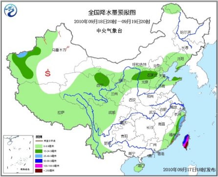 17日20時(shí)至18日20時(shí),新疆西部、青海東部、西藏大部、甘肅中東部、寧夏、陜西北部、內(nèi)蒙古中南部、遼寧、吉林南部、華北大部、山東西北部、四川中西部、云南西部、浙江南部、福建東部和南部、臺(tái)灣、廣東中東部、海南東部等地有小到中雨或陣雨,其中,山西北部、河北中部和東部、遼寧南部、臺(tái)灣東部、新疆南疆西部山區(qū)等地的部分地區(qū)有大雨,局部暴雨;上述地區(qū)局部并伴有短時(shí)雷雨大風(fēng)或冰雹等強(qiáng)對(duì)流天氣。新疆南疆中東部、甘肅西部等地有4~6級(jí)風(fēng),并伴有揚(yáng)沙或沙塵暴。臺(tái)灣以東洋面將有7~9級(jí)大風(fēng),部分海域的風(fēng)力將有10~12級(jí),臺(tái)風(fēng)中心經(jīng)過的附近洋面將有13~16級(jí)大風(fēng);東海南部海域?qū)⒂?~8級(jí)偏東風(fēng);臺(tái)灣海峽的東北風(fēng)將由5~6級(jí)增加到7~8級(jí);臺(tái)灣以南海域?qū)⒂?~7級(jí)偏西或西北風(fēng)。另外,渤海將有5~7級(jí)東北風(fēng)。
