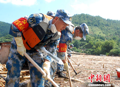 從昨夜開始,前期到達(dá)的部分官兵及工程車輛在高州重災(zāi)區(qū)馬貴鎮(zhèn),疏通道路、搜索失蹤人員、搶救物資;工兵分隊(duì)奔赴信宜市對危險(xiǎn)山體進(jìn)行爆破,部分陸戰(zhàn)隊(duì)員對廣東省第三大水庫高州水庫水面漂浮物進(jìn)行清理。指揮員張文勝上校告訴筆者,目前工程機(jī)械分隊(duì)連夜打通長約1公里被泥石流堵塞的道路,清污的官兵已打撈起數(shù)十噸水面污染物,工兵分隊(duì)正在對爆破體進(jìn)行前期論證。 完