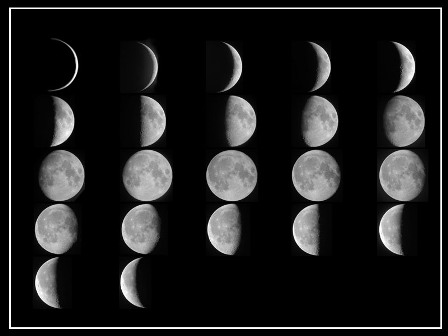 月球位于日、地之間時叫做“朔”,月球暗的半個球朝向地球,我們看不到它。朔之后的一兩天,鐮刀狀的新月在傍晚西方的天空中露面,凸面向著落日的方向。以后月球相對于太陽逐漸向東移動,亮的部分日益擴(kuò)展。五六天以后成了半圓形,這時的月相稱為“上弦”,日落時月球在天子午線附近。再經(jīng)過7天,便到了“望”(滿月),月球與太陽遙遙相望,我們看到的是一輪明月于傍晚東升,在晨曦中西落,將黑夜照耀得如同白晝一般。滿月以后,圓輪的西部日益虧缺。到“下弦”時,呈半圓形,月球到半夜才升起。和上弦月相反,下弦月是東邊半個圓被照亮。下弦以后,半圓繼續(xù)虧缺,成為黎明前掛在東方天空的一絲殘?jiān)隆K鷣碛咏枺K于跑到和太陽相同的方向,朔又來臨了。