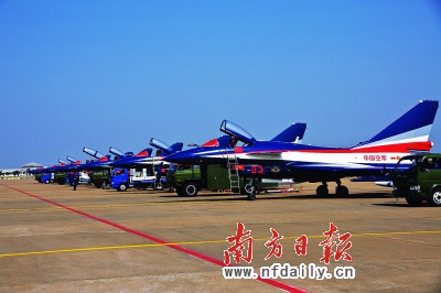 據介紹,換裝殲10后,中國空軍八一飛行表演隊于2009年11月中國人民解放軍空軍成立60周年慶典上以四機編隊震撼亮相。目前,八一表演隊以六機特技編隊為主,穿插四機編隊動作和單機特技表演,能夠飛出六機三角編隊、四機菱形編隊、五機開花、四機垂直開花、雙機剪刀機動、雙機對頭和單機特技等多種飛行表演動作!(記者/王暉輝通訊員/李意輝)