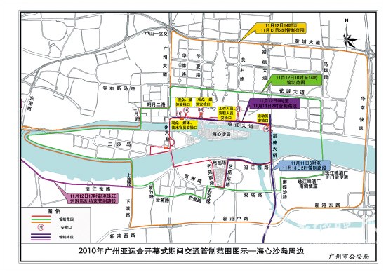 11月12日廣州亞運會開幕式將在天河區珠江新城南側的海心沙島舉行,廣州市政府、市公安局、市交警支隊9日晚召開了新聞通氣會,通告了當夜海心沙島周邊道路及珠江巡游兩岸道路分時分段交通管制的詳細措施。