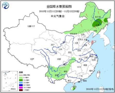 11日20時至12日20時,內(nèi)蒙古中東部、東北大部、河北西北部等地有小到中(雨)雪或雨夾雪,其中,內(nèi)蒙古東部偏南地區(qū)、遼寧北部、吉林大部、黑龍江東南部等地有大雪,內(nèi)蒙古東部偏南地區(qū)、吉林中部、黑龍江東南部等地的部分地區(qū)有暴雪;川西高原南部、重慶東部、湖北西南部、云南大部、貴州大部、廣西西部、海南大部等地有小到中雨。內(nèi)蒙古西部和東部、華北、東北地區(qū)、黃淮等地有4~6級風(fēng)。山東半島附近有揚沙或浮塵天氣。渤海、黃海北部和中部將有7~8級、陣風(fēng)9級的西北風(fēng);臺灣海峽、臺灣以東洋面和以南海域、南海東北部海域?qū)⒂?~8級的東北風(fēng)。