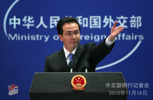 2010年11月16日,外交部發(fā)言人洪磊主持例行記者會,就巴以和談、幾內(nèi)亞大選、中俄印外長會晤等問題回答了記者提問。答問全文如下: