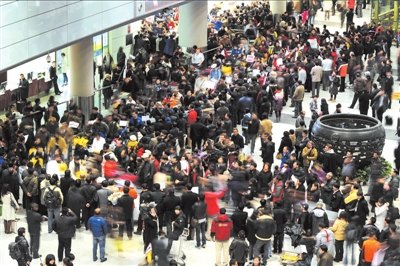 昨天下午,大量乘客滯留在候機廳內,延誤通知不斷重播,多數乘客表示不滿。乘客孫女士氣憤地說,他們一行20人從北京飛往上海,原定上午9點半起飛,已經在此處等候了8個小時,“剛一問,對方說可能要明天起飛”,此話引起眾人不滿,多人要求機場方解決食宿問題,但對方始終稱“需要協調”。