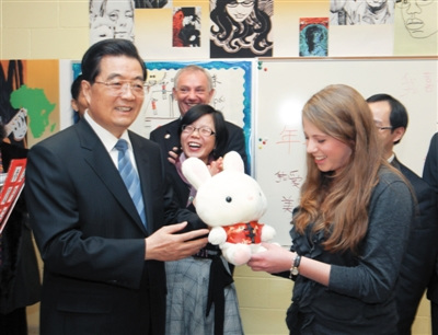 胡錦濤也選擇了一所中學(xué)參觀——芝加哥佩頓中學(xué),并向中文班學(xué)生贈送新春禮物,一個白兔玩偶。在中美發(fā)表的聯(lián)合聲明中,雙方重申致力于建設(shè)二十一世紀(jì)積極合作全面的中美關(guān)系。