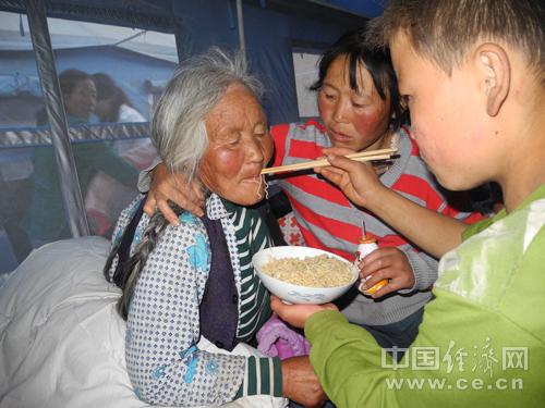 在定西“7·22”地震中,岷縣梅川鎮(zhèn)永光村70多歲的李改花老婆婆一家5口有4人遇難,年僅10歲的外孫子后智斌一夜間變成了“小大人”。他說自己要好好孝敬外婆,讓外婆以后的日子過得幸福快樂。圖為小后智斌在抗震棚里給外婆喂飯。(記者 黃俊毅 攝)