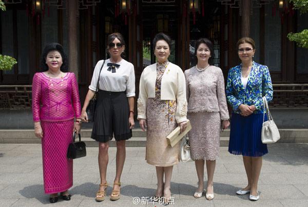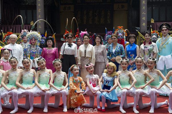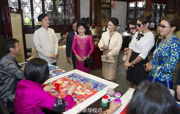 彭麗媛和貴賓們到上海豫園,參觀金山農(nóng)民畫(huà)、面塑、顧繡、木版水印、扎染等展示,欣賞少兒歌舞《茉莉花》、昆曲《牡丹亭》選段、滬劇與二胡《燕燕做媒》、太極·古琴《高山流水》、京劇選段《梨花頌》等演出。