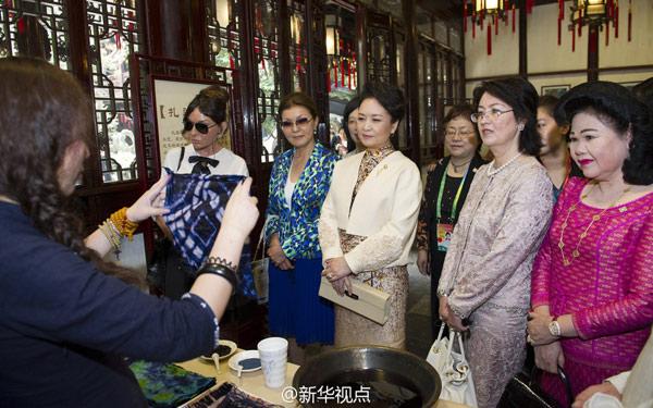彭麗媛和貴賓們?cè)谠@靜觀的展臺(tái)前駐足停留,聽(tīng)取介紹。彭麗媛不時(shí)拿起面塑、扎染布等傳統(tǒng)手工藝品給貴賓們欣賞!稗r(nóng)民畫(huà)用的是什么顏料?”“木版水印和版畫(huà)有什么區(qū)別?”“扎染布會(huì)褪色嗎?”……大家紛紛提問(wèn),同非物質(zhì)文化遺產(chǎn)傳承人親切交流。