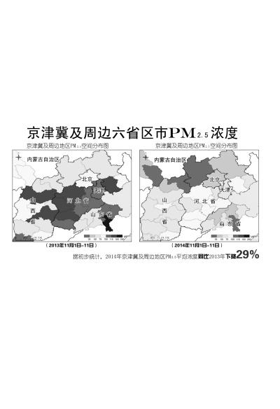 APEC期間區域大氣環境遙感監測結果顯示,京津冀及周邊地區大氣PM2.5濃度同步出現了不同程度的下降,各地空氣質量都得到了明顯改善。