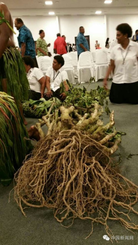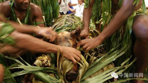 喝完卡瓦汁,斐濟原住民又把烤豬、芋頭什么的抬上來啦,一人還上前致祝福語。習大大點頭致意。斐濟禮賓官代表習大大接受獻品并致謝。然后,原住民將食物抬下。