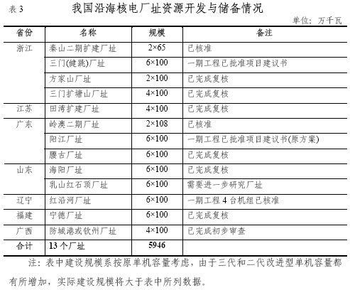 從廠址條件看,到2020年,表3所列核電廠址容量可以滿足運行4000萬千瓦、在建1800萬千瓦的目標。結合我國能源資源和生產力布局情況,從現在起到2020年,新增投產2300萬千瓦的核電站,將主要從上述沿海省份的廠址中優先選擇,并考慮在尚無核電的山東、福建、廣西等沿海省(區)各安排一座核電站開工建設。