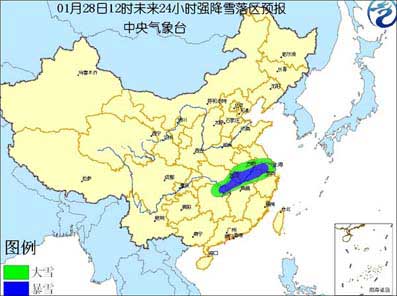 受冷暖空氣的共同影響,預計今天中午到明天中午,湖南東北部、湖北東部、河南東南部、安徽中南部、江蘇中南部、浙江西北部以及江西北部等地有大雪,其中,湖南東北部、湖北東部、安徽中南部、江蘇南部等地的部分地區有暴雪。