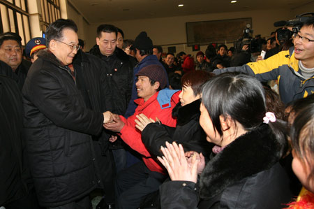 溫家寶還來到長沙火車站看望滯留車站的乘客。他動情地說:“對大家滯留在這里,我向大家表示歉意,我們正在抓緊搶修,首先是搶修電網,電網通了以后,火車就會通了,不需要很多的時間,大家就可以回家過年。春節快到了,我給大家拜個早年,謝謝大家!”
