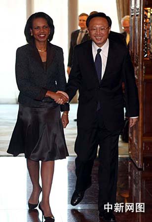 中新網北京2月26日電(記者 張朔 周兆軍)中國外長楊潔篪26日上午在北京釣魚臺國賓館與到訪的美國國務卿賴斯舉行會談。