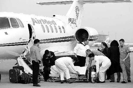 在新鄭國際機場的停機坪內,記者看到一架紅白相間的小型噴氣式飛機,機身上紅色十字的救護標志十分醒目,飛機降落后,飛機內的外籍機務人員和護士用專用的醫用擔架,將正在熟睡中的鄭麗抬下飛機,送上機場的120急救車,然后送往鄭州市內一家醫院,整個過程用了半個小時。
